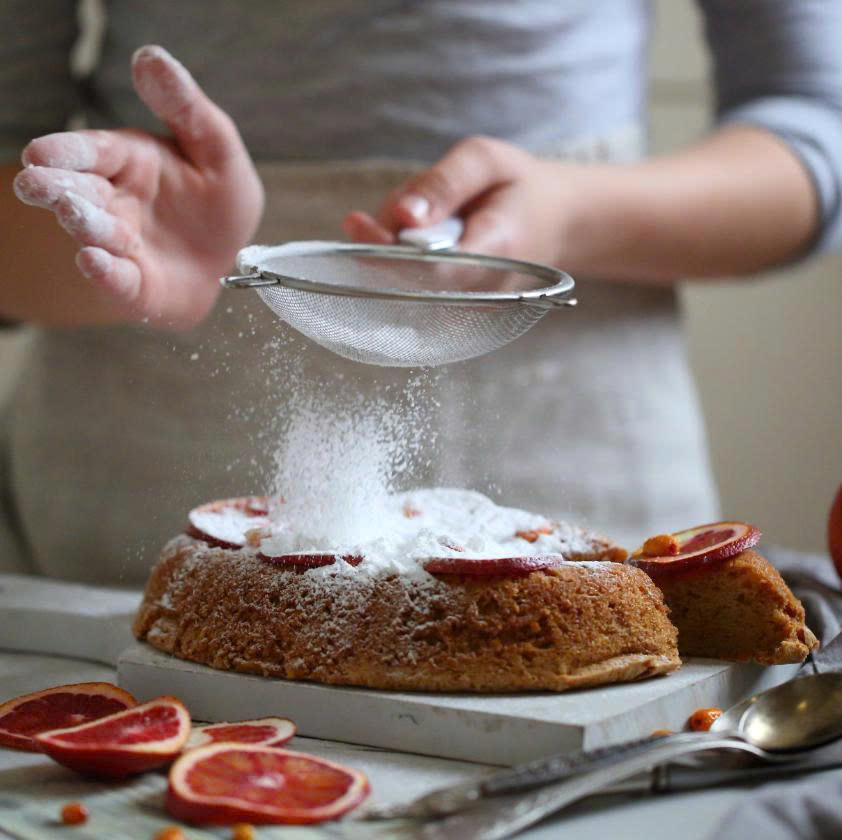 Hướng dẫn sử dụng: Dùng rây để rây đều một lớp mỏng đường tuyết lên bề mặt bánh