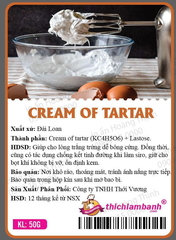 Đây là loại bột được tạo ra sau quá trình chưng cất nho thành rượu, không mùi và có vị chua. Bột Cream of Tartar là chất phụ gia không thể thiếu trong làm bánh, có màu trắng và mịn, có công dụng làm mịn lòng trắng trứng.