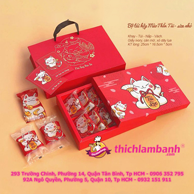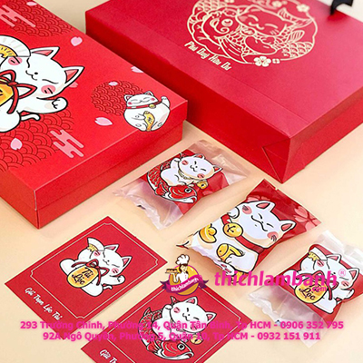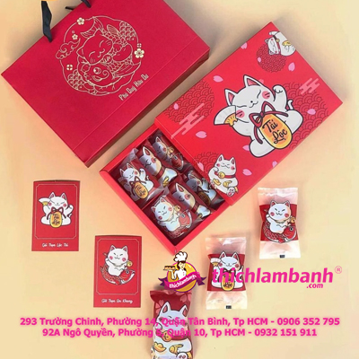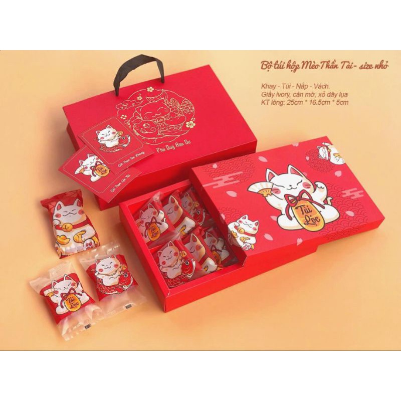 Bộ Túi + hộp Mèo Thần Tài được bánh dứa, kẹo nougat hoặc các loại bánh kẹo mứt tết khác.