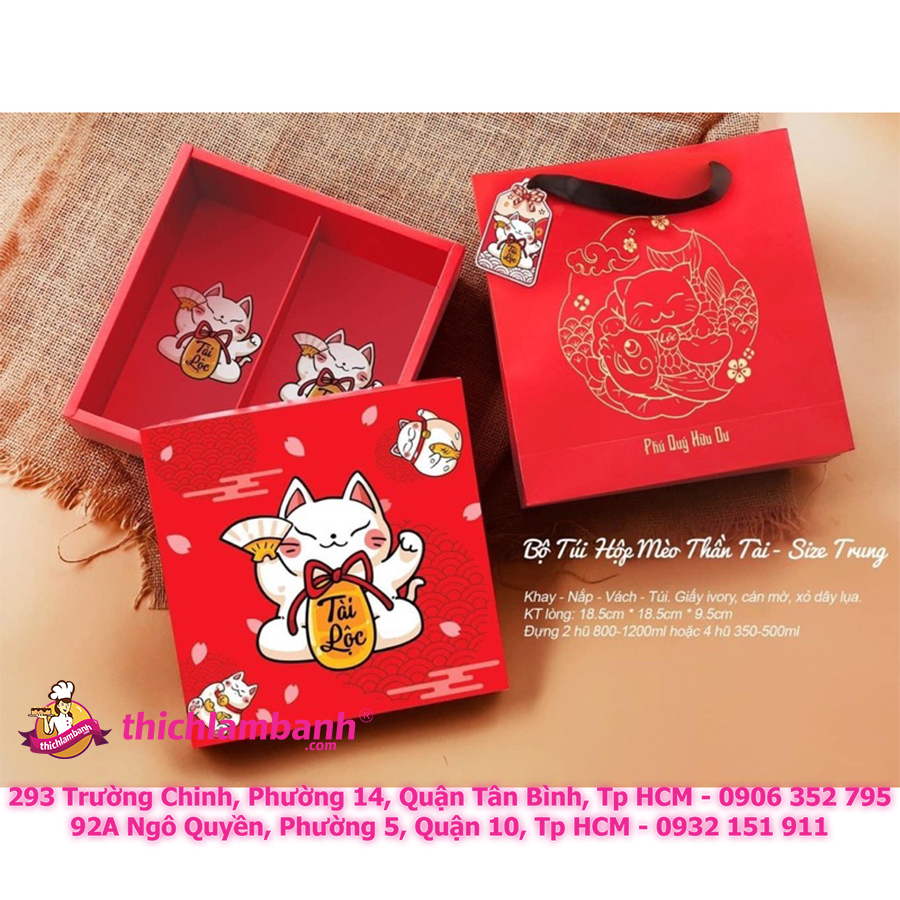 Bộ Túi + hộp Mèo Thần Tài được bánh dứa, kẹo nougat hoặc các loại bánh kẹo mứt tết khác.