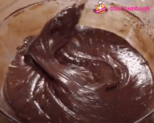Rây vào hỗn hợp 65gr bột mì, 35gr bột ca cao và khoảng ½ muỗng cà phê bột nổi. Dùng phới trộn từ dưới hất lên, đảo theo 1 chiều, trộn đến khi nào bột hòa quyện là được.