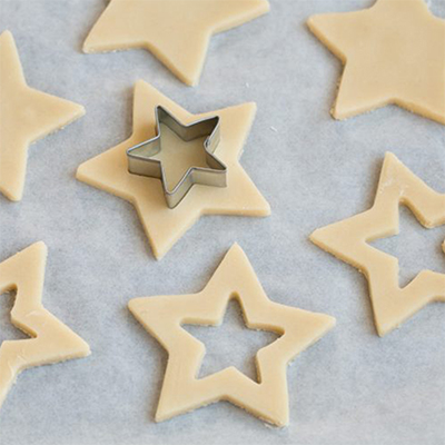 Lấy bột ra chia thành các phần để bắt đầu tạo hình. Dùng khuôn bánh quy hình ngôi sao (bạn có thể dùng bất cứ khuôn hình dạng nào mình có nhé) cắt bột thành các miếng bánh. Sau đó dùng 1 khuôn ngôi sao nhỏ hơn để cắt phần bột bên trong. Số bột còn thừa các bạn lại tiếp tục nhào, sau đó cán mỏng và tiếp tục cắt thành các ngôi sao cho đến khi nào hết nhé!
