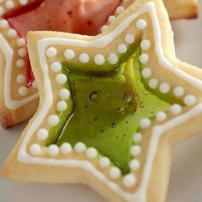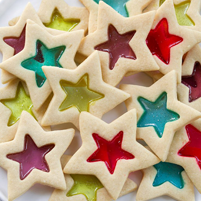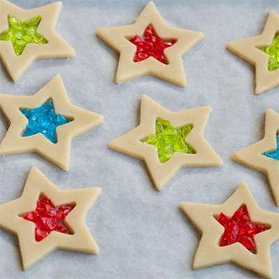 Đặt các ngôi sao lên những khay nướng có lót sẵn giấy nến. Lúc này, làm nóng lò ở 170 độ trước. Cho các phần kẹo màu vào tâm của các ngôi sao.