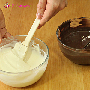 Đặt chocolate trắng và đen vào 2 tô riêng biệt, cho vào lò vi sóng để làm chocolate chảy ra hoặc có thể đun cách thủy nếu nhà bạn không có lò vi sóng.
