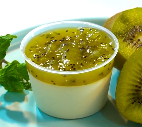 Khi panna cotta đã đông, lấy ra cho nước sốt kiwi lên bề mặt và thưởng thức