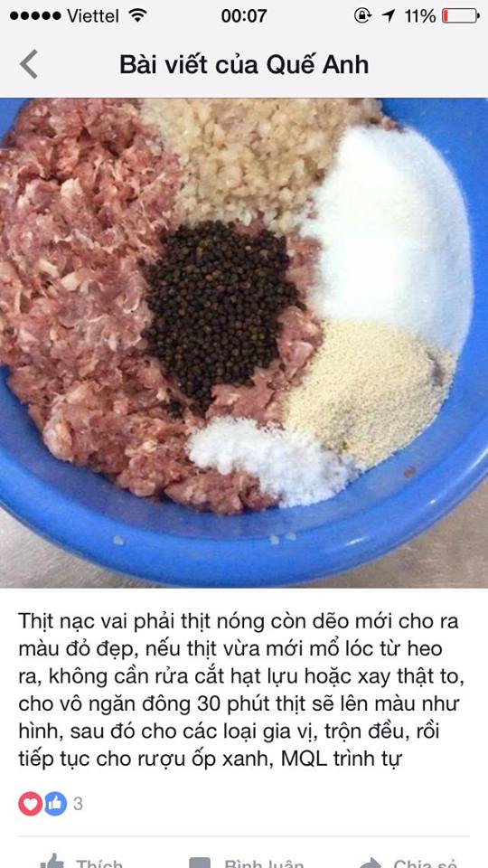 2. Thịt nạc vai phải lựa thịt nóng còn dẽo mới cho ra màu đỏ đẹp, nếu thịt mới vừa mổ lóc từ heo ra không cần rửa cắt hạt lựu hoặc xay hạt thật to cho vô ngăn đông 30p sau đó cho các loại gia vị vào trộn đều rồi tiếp tục cho rượu ốp xanh, mai quế lộ theo trình tự