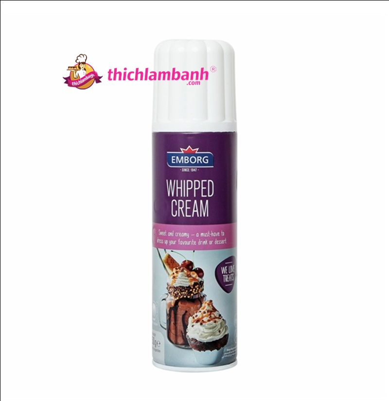 Kem xịt Emborg 250ml là loại kem tươi có nguồn gốc động vật, được làm từ sữa bò tươi. Whipped Cream có độ béo vừa phải (20%), vị ngậy, thơm của kem sữa và tan trong miệng. Do được tách ra từ sữa bò tươi nguyên chất nên sản phẩm không chứa đường, được dùng để trang trí mặt bánh và nhiều món ăn, đồ uống khác.
